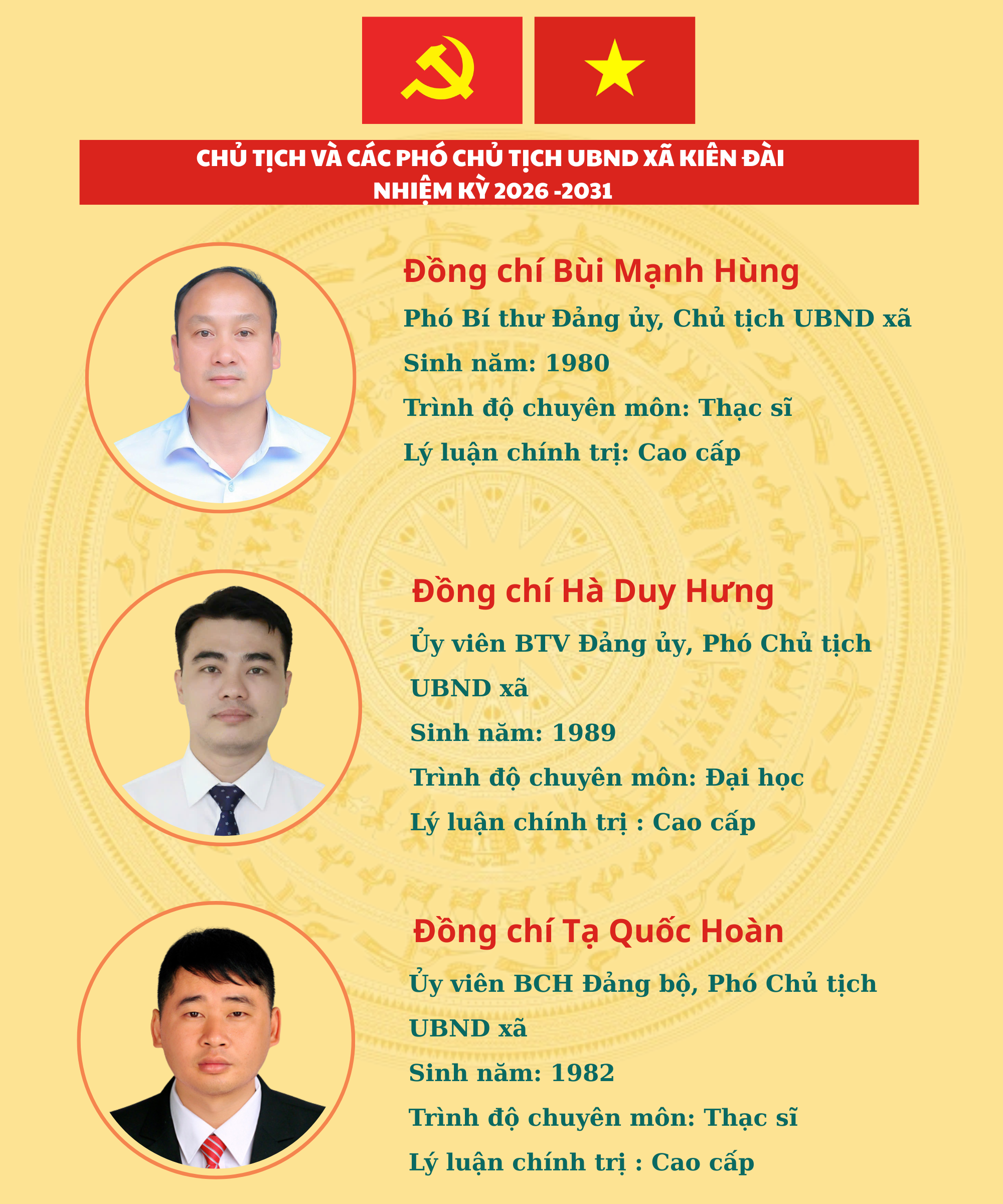 Chịu trách nhiệm chính: ÔngTạ Quốc Hoàn, Phó Chủ tịch UBND xã Kiên Đài.