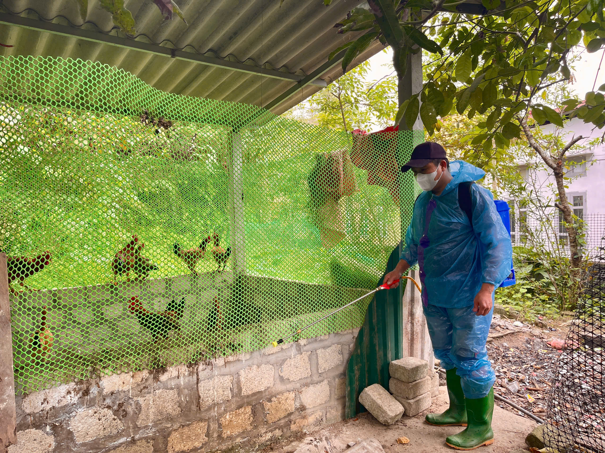 Người dân đang tiến hành phun thuốc sát trùng tiêu độc lên khu vực nền móng chuồng gà