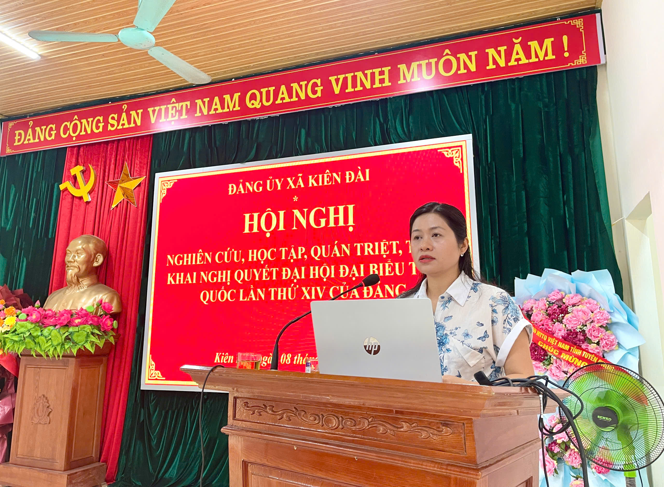 Đồng chí Lâm Thị Hồng Ngân, Bí thư Đảng ủy, Chủ tịch HĐND xã Kiên Đài báo cáo viên tại Hội nghị, quán triệt các nội dung trọng tâm và triển khai nhiệm vụ Quý II/2026.
