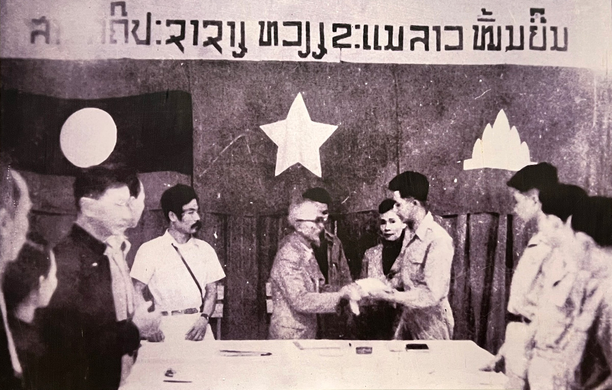 Quyền Trưởng ban Thường trực Quốc hội Tôn Đức Thắng tặng Quốc kỳ Việt Nam cho đoàn Ítxarắc (Miên) tại Hội nghị Liên minh nhân dân ba nước Việt - Miên - Lào ở xã Kim Bình, tháng 3-1951.