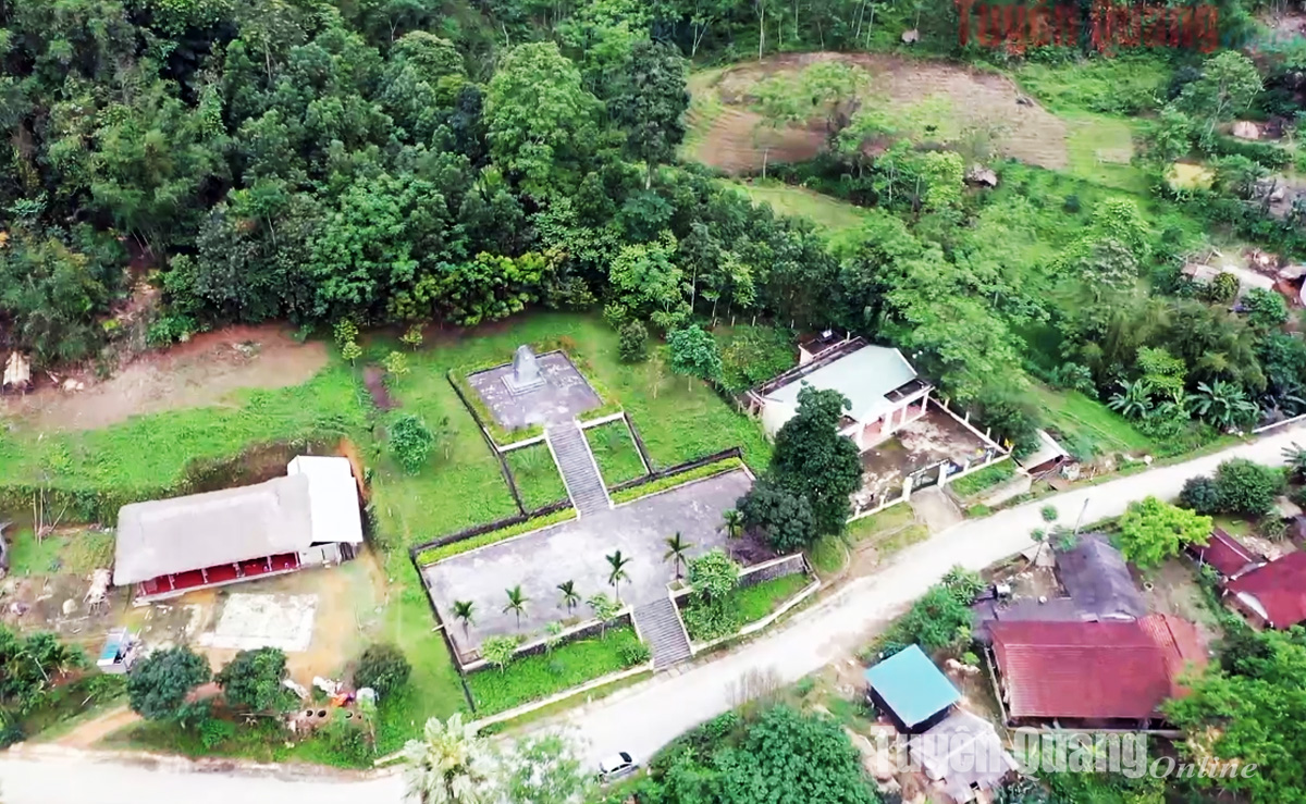 Toàn cảnh bia di tích và khuôn viên Di tích lịch sử Mặt trận Dân tộc thống nhất Việt Nam tại thôn Làng Khây 1, xã Kiên Đài (ảnh chụp từ trên cao)