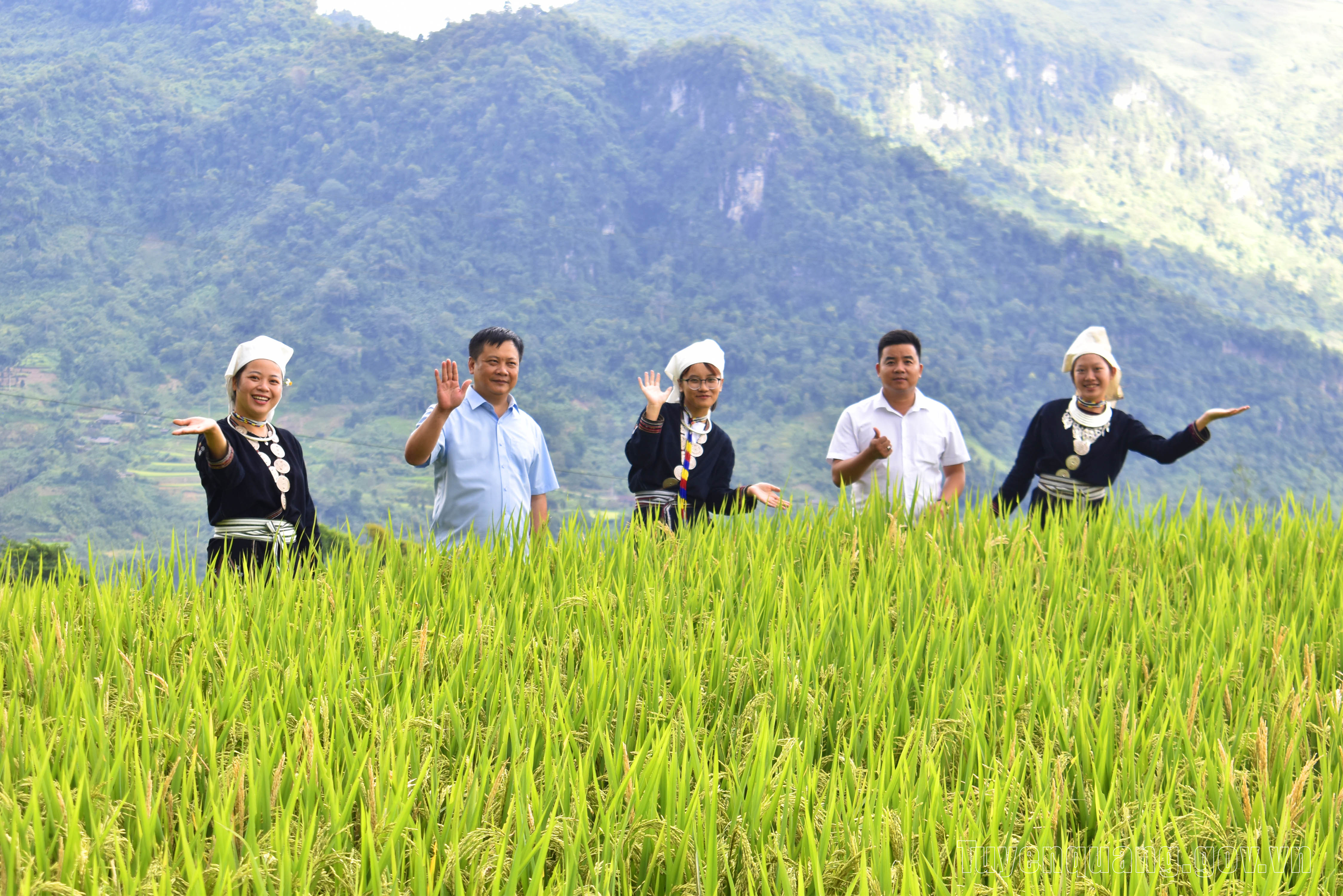 Những thiếu nữ Dao Tiền lưu giữ khoảnh khắc bên ruộng bậc thang ở Hồng Thái.
