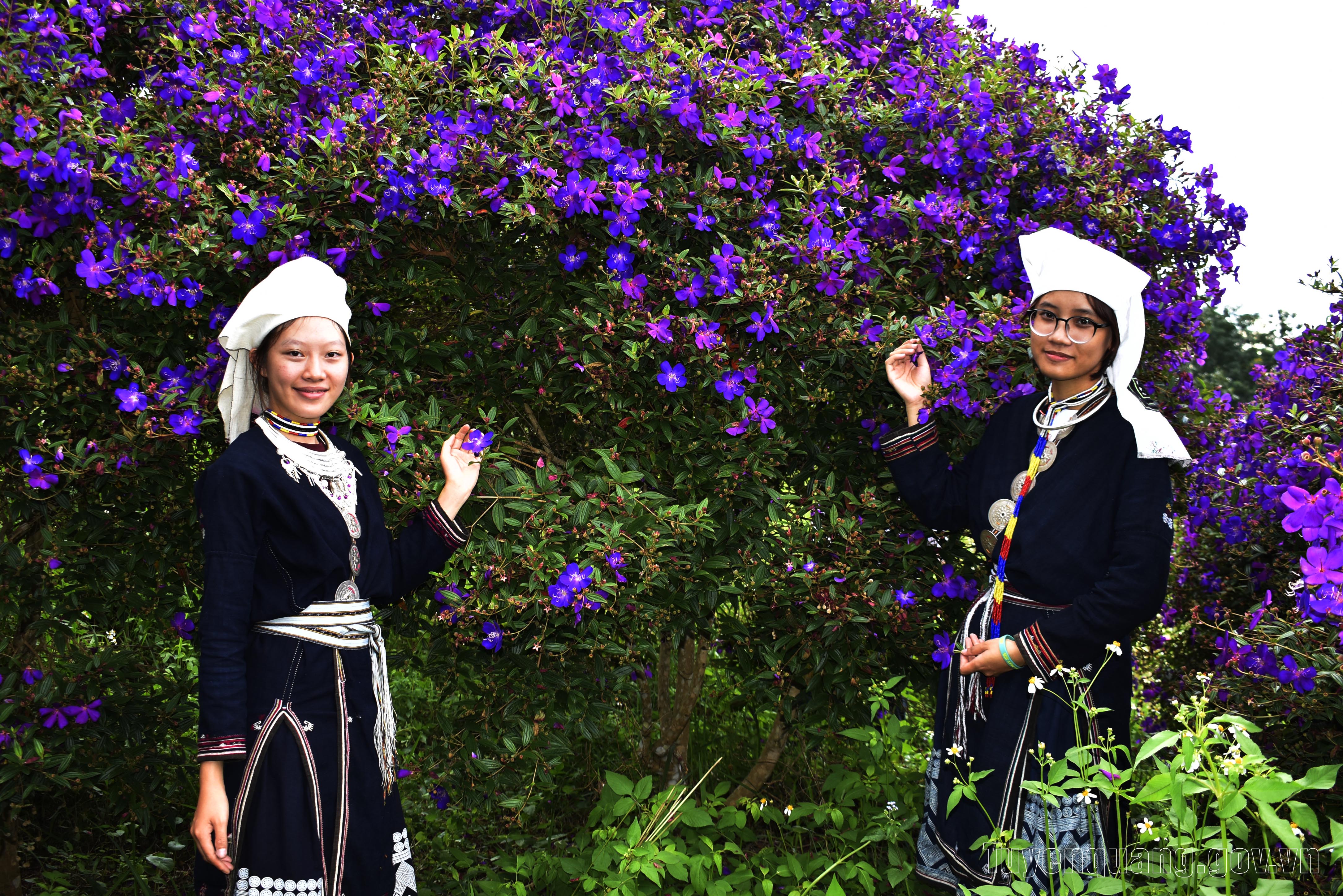 Thiếu nữ Dao Tiền duyên dáng check-in giữa sắc tím rực rỡ hoa sim, tạo điểm nhấn thơ mộng cho bức tranh thiên nhiên Hồng Thái.