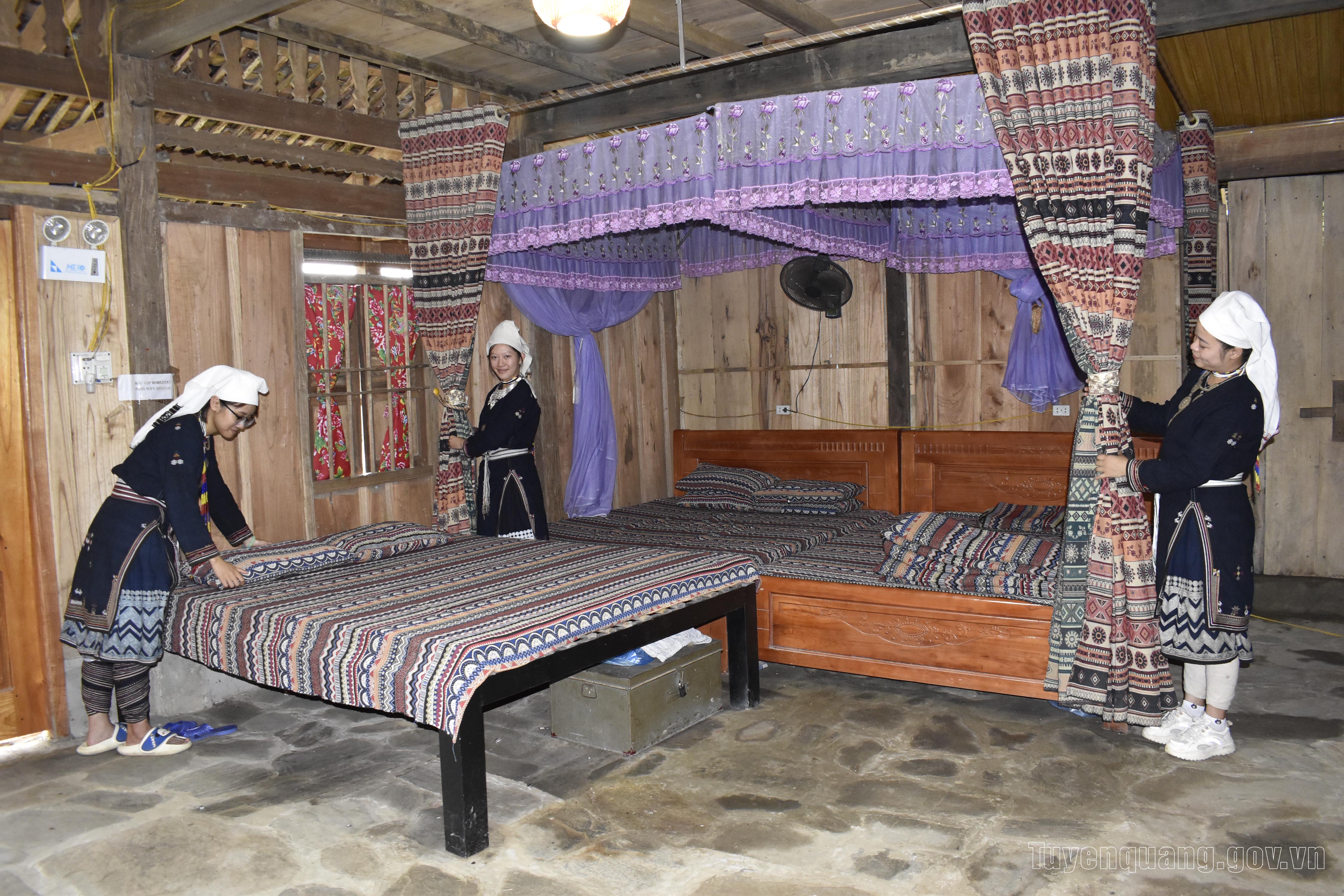 Không gian phòng nghỉ cộng đồng tại homestay Mác Cọp mang đậm nét mộc mạc, gần gũi với đời sống người Dao Tiền.