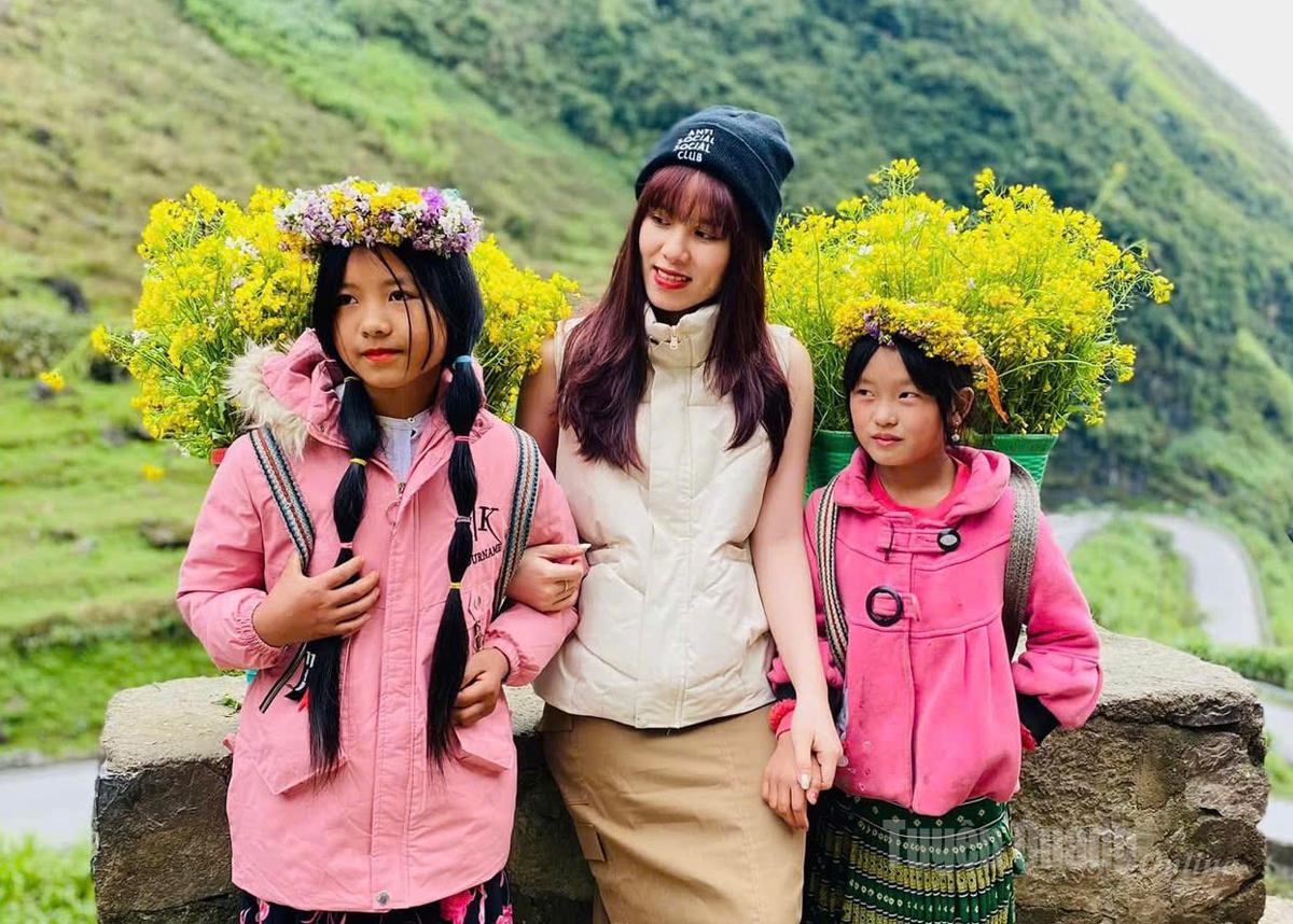 Du khách chụp ảnh tại dốc Thẩm Mã cùng với những em bé người Mông.