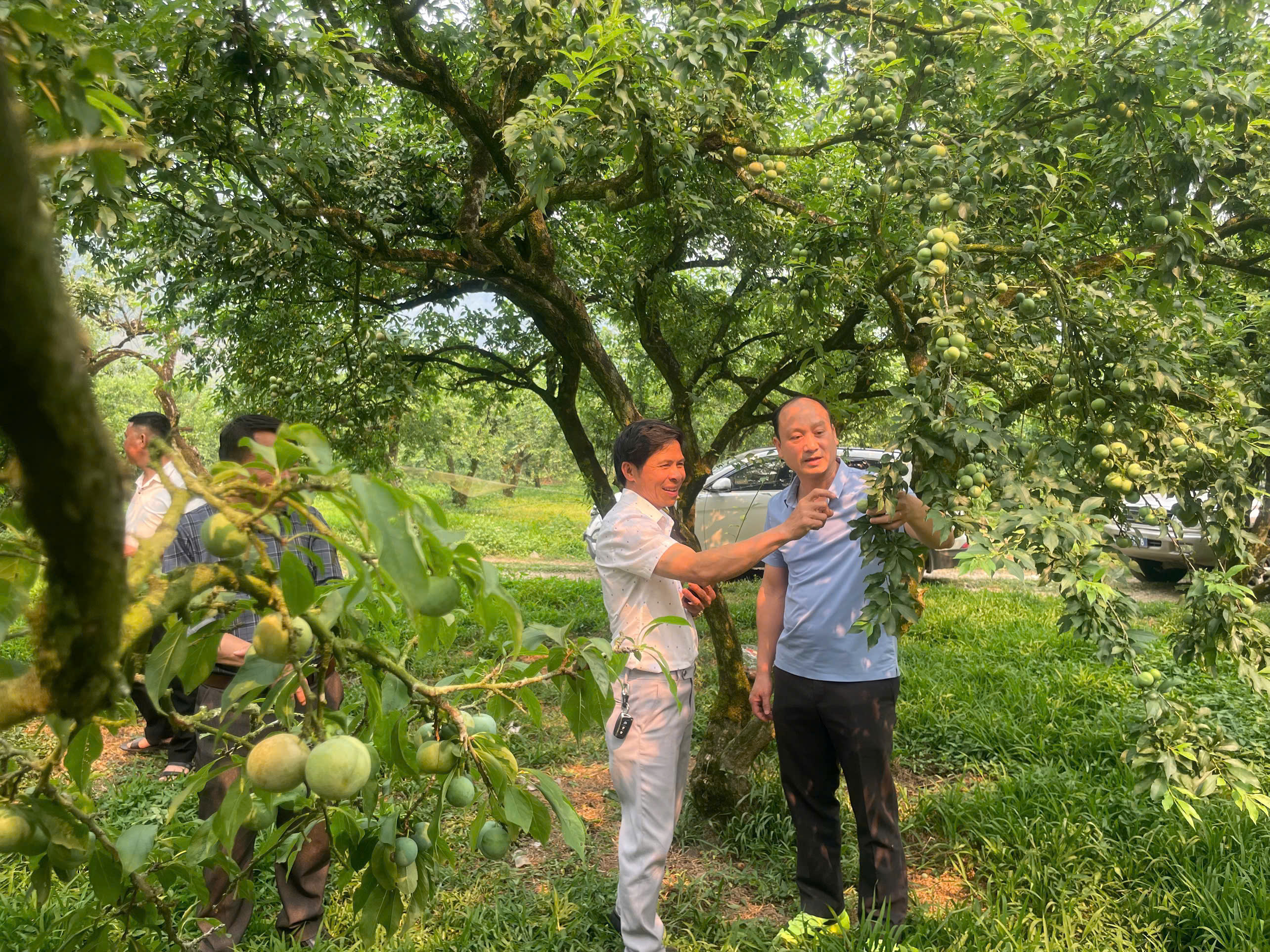 Tại phường Thảo Nguyên, đoàn đã trực tiếp tham quan các mô hình trồng mận, trao đổi với người dân về quy trình lựa chọn giống, kỹ thuật trồng, chăm sóc theo hướng thâm canh, cũng như kinh nghiệm liên kết tiêu thụ sản phẩm. Ngay trong chuyến công tác, đoàn đã tuyển chọn và tiếp nhận nguồn giống mận đạt tiêu chuẩn để đưa về trồng thí điểm tại thôn Khau Tàm.