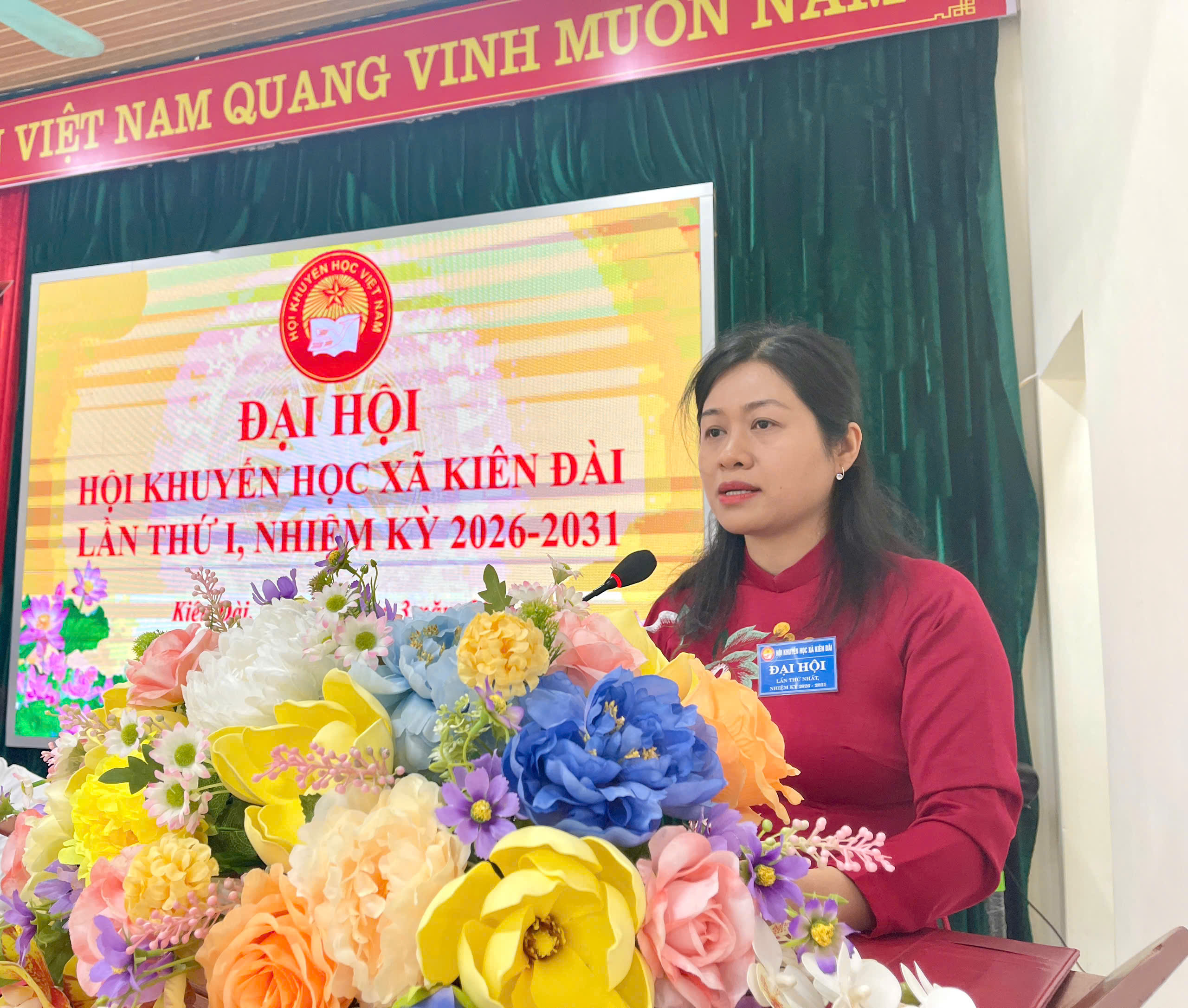 Phát biểu chỉ đạo tại Đại hội, đồng chí Vũ Thị Bích Việt ghi nhận và biểu dương những kết quả đạt được của phong trào khuyến học xã Kiên Đài; đồng thời đề nghị trong nhiệm kỳ tới, Hội Khuyến học xã cần tiếp tục đổi mới nội dung, phương thức hoạt động; đẩy mạnh xây dựng các mô hình học tập; nâng cao hiệu quả công tác tuyên truyền, vận động toàn dân tham gia học tập suốt đời; tăng cường huy động các nguồn lực xã hội hóa, góp phần nâng cao dân trí, đào tạo nhân lực, bồi dưỡng nhân tài cho địa phương.