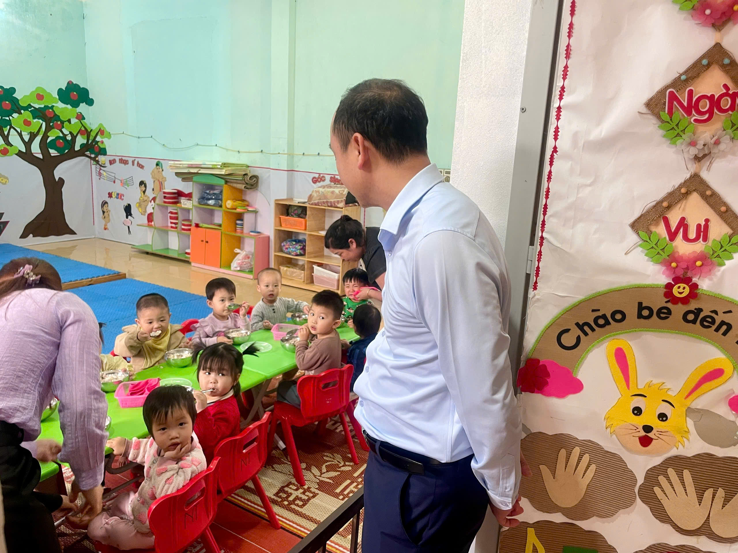 Đồng chí Bùi Mạnh Hùng, Phó Bí thư Đảng ủy, Chủ tịch UBND xã kiểm tra bữa ăn bán trú của học sinh tại một lớp mầm non trên địa bàn, trực tiếp theo dõi khẩu phần ăn và công tác chăm sóc, nuôi dưỡng trẻ.