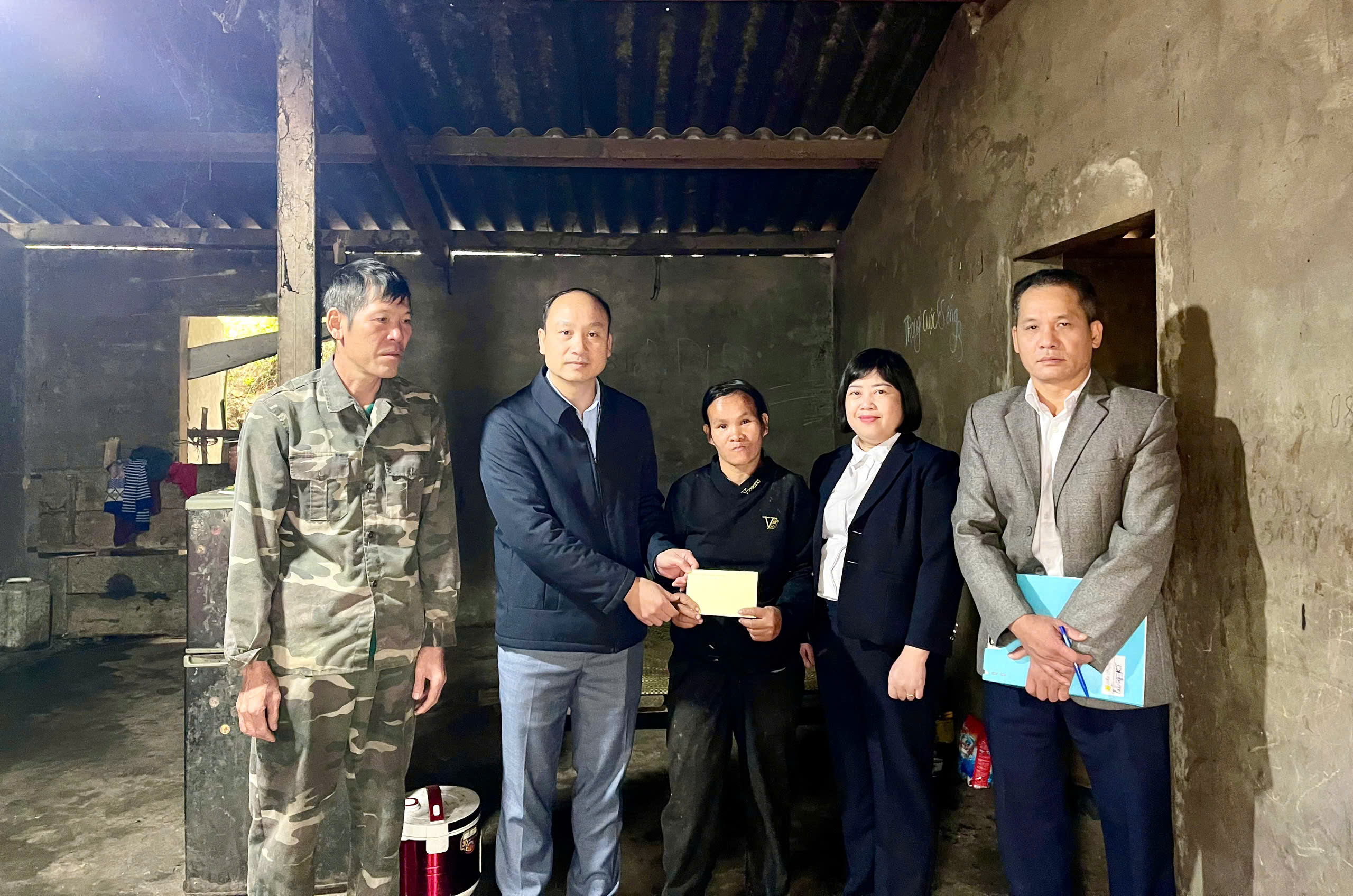 Đồng chí Bùi Mạnh Hùng, Phó Bí thư Đảng ủy, Chủ tịch UBND xã Kiên Đài trao tiền hỗ trợ cho gia đình bà Chu Thị Tấm, thôn Nà Chám.