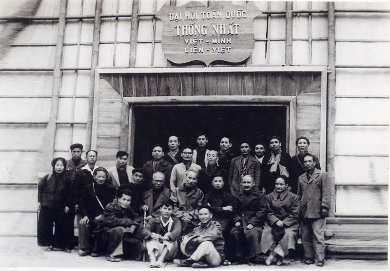 Chủ tịch Hồ Chí Minh, đồng chí Tôn Đức Thắng, cùng các đại biểu chụp ảnh lưu niệm tại Hội trường tổ chức Đại hội toàn quốc thống nhất Việt Minh - Hội Liên Việt. (Ảnh tư liệu)