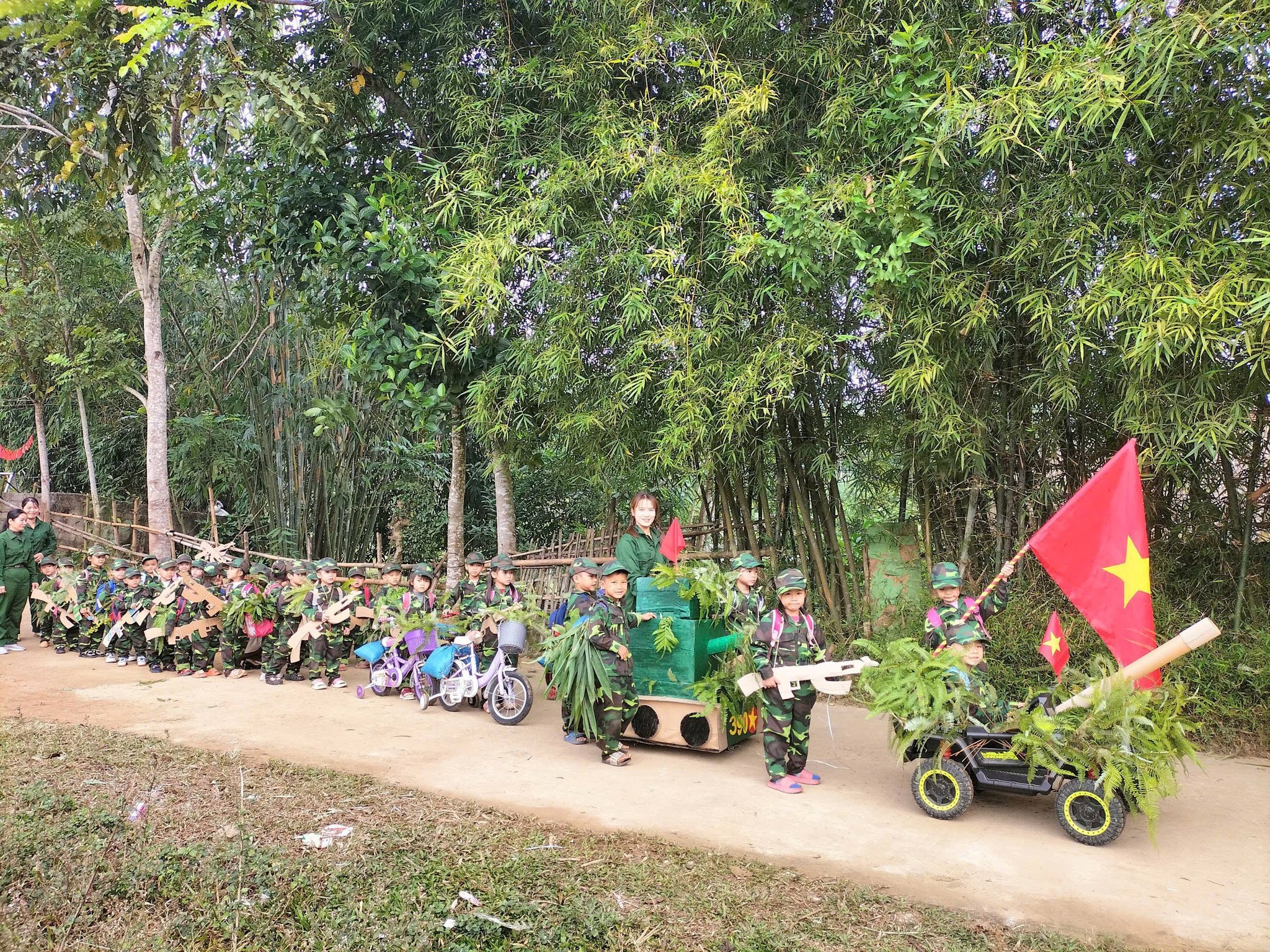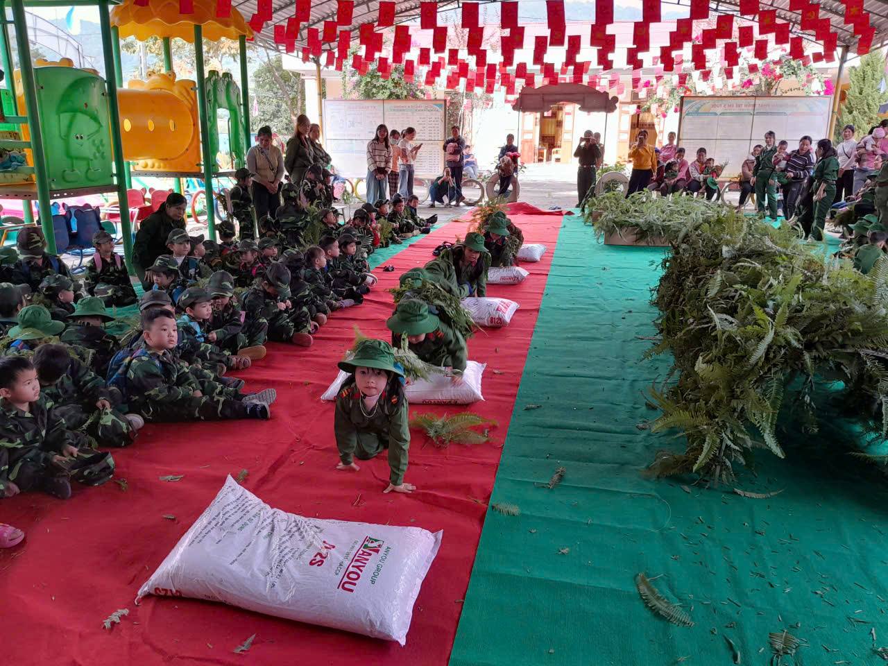 Theo đó, Trường Mầm non Phú Bình đã tổ chức cho trẻ tham gia các hoạt động trải nghiệm như đi thăm, tìm hiểu các khu di tích lịch sử nằm trên địa bàn xã, giúp các em bước đầu làm quen với những địa danh gắn liền với lịch sử cách mạng của quê hương. Bên cạnh đó, nhà trường còn phối hợp tổ chức hoạt động “Bé tập làm chiến sĩ nhí” tại các lớp và các điểm trường, với nhiều nội dung phong phú như mặc trang phục bộ đội, tập đội hình đội ngũ, rèn luyện tác phong nhanh nhẹn, kỷ luật. Thông qua các hoạt động này, trẻ được trải nghiệm không khí vui tươi, bổ ích, đồng thời hình thành những nhận thức ban đầu về hình ảnh người chiến sĩ Quân đội Nhân dân Việt Nam.