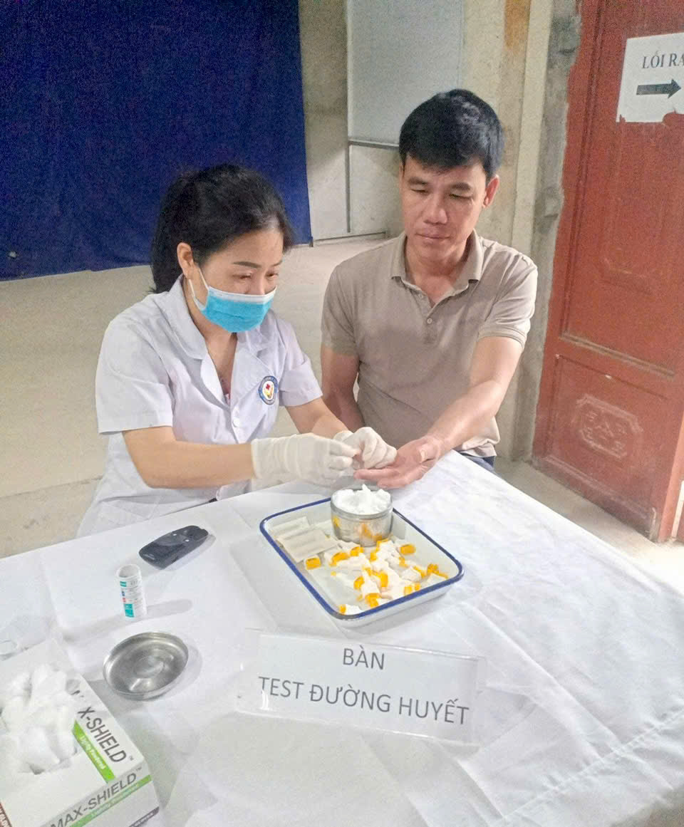 Cán bộ Trạm Y tế xã Kiên Đài thực hiện đo đường huyết, tư vấn chăm sóc sức khỏe cho người dân tại điểm khám trên địa bàn.