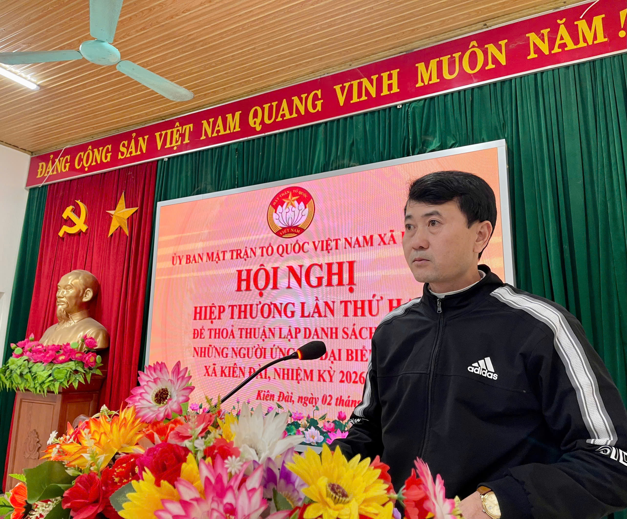 Tại hội nghị, các đại biểu đã nghe báo cáo tổng hợp kết quả Hội nghị hiệp thương lần thứ nhất; Báo cáo kết quả gới thiệu ứng cử đại biểu HĐND xã Kiên Đài, nhiệm kỳ 2026-2031 của các cơ quan, tổ chức, đơn vị, thôn; lập danh sách sơ bộ những người ứng cử Đại biểu HĐND xã nhiệm kỳ 2026-2031; thông qua Dự thảo kế hoạch tổ chức hội nghị lấy ý kiến nhận xét và tín nhiệm của cử tri nơi cư trú đối với người ứng cử Đại biểu Quốc hội khóa XVI và đại biểu HĐND các cấp, nhiệm kỳ 2026-2031.