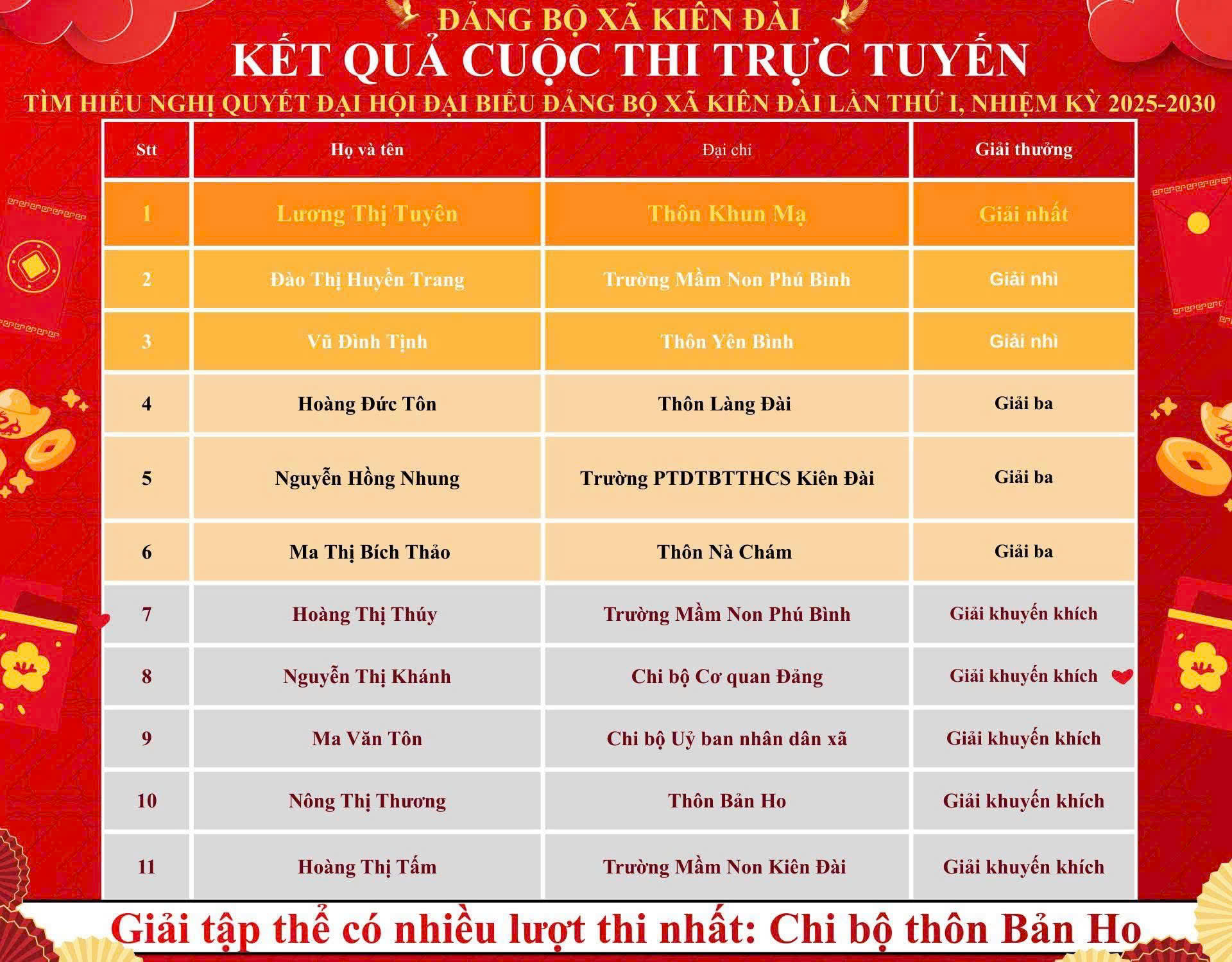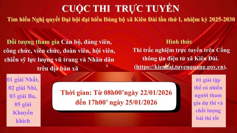 THÔNG BÁO KẾT QUẢ THI TRỰC TUYẾN Cuộc thi trực tuyến tìm hiểu Nghị quyết Đại hội đại biểu Đảng bộ xã Kiên Đài lần thứ I, nhiệm kỳ 2025 - 2030 diễn ra từ ngày 22/01/2026 - 25/02/2026