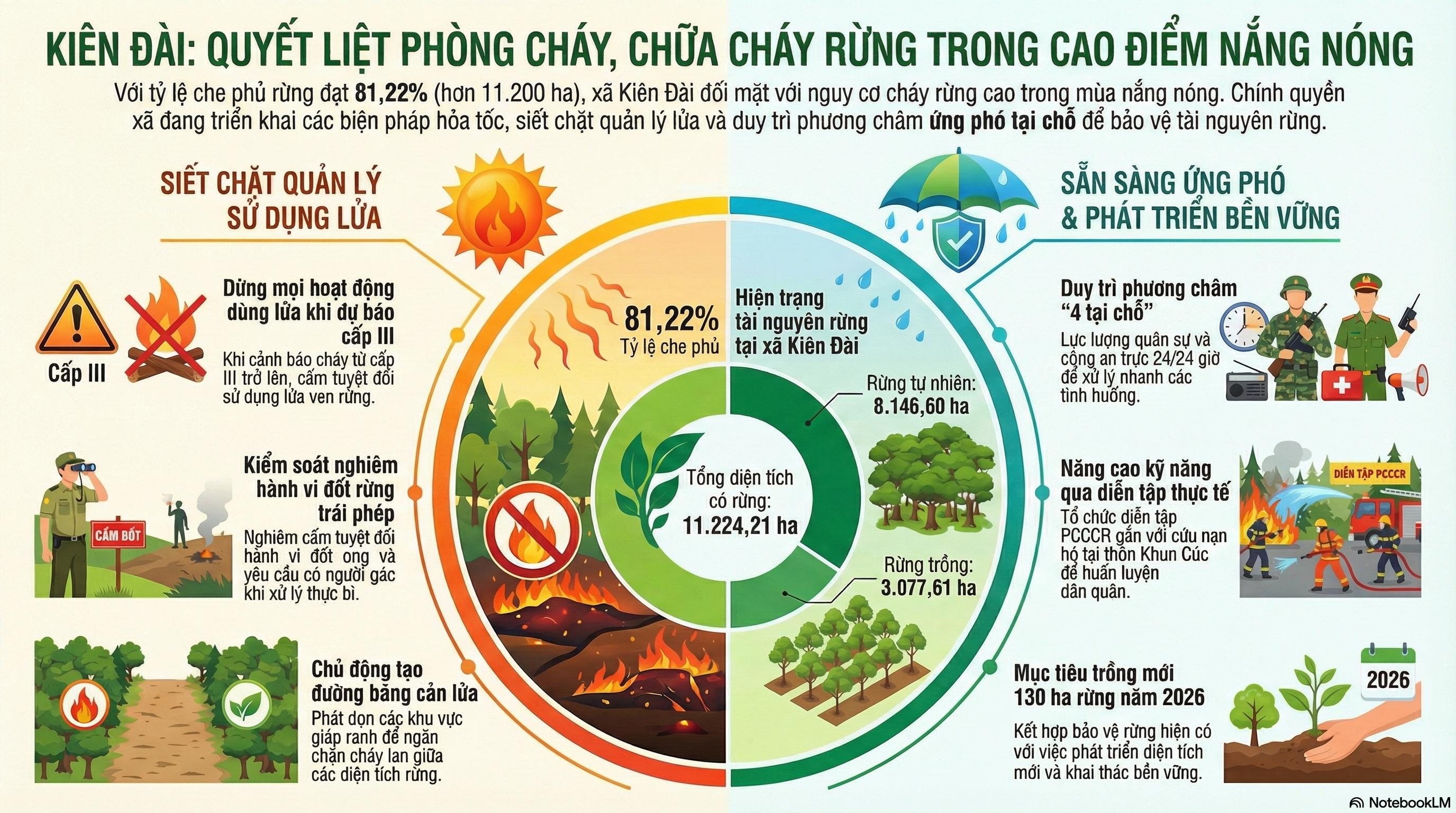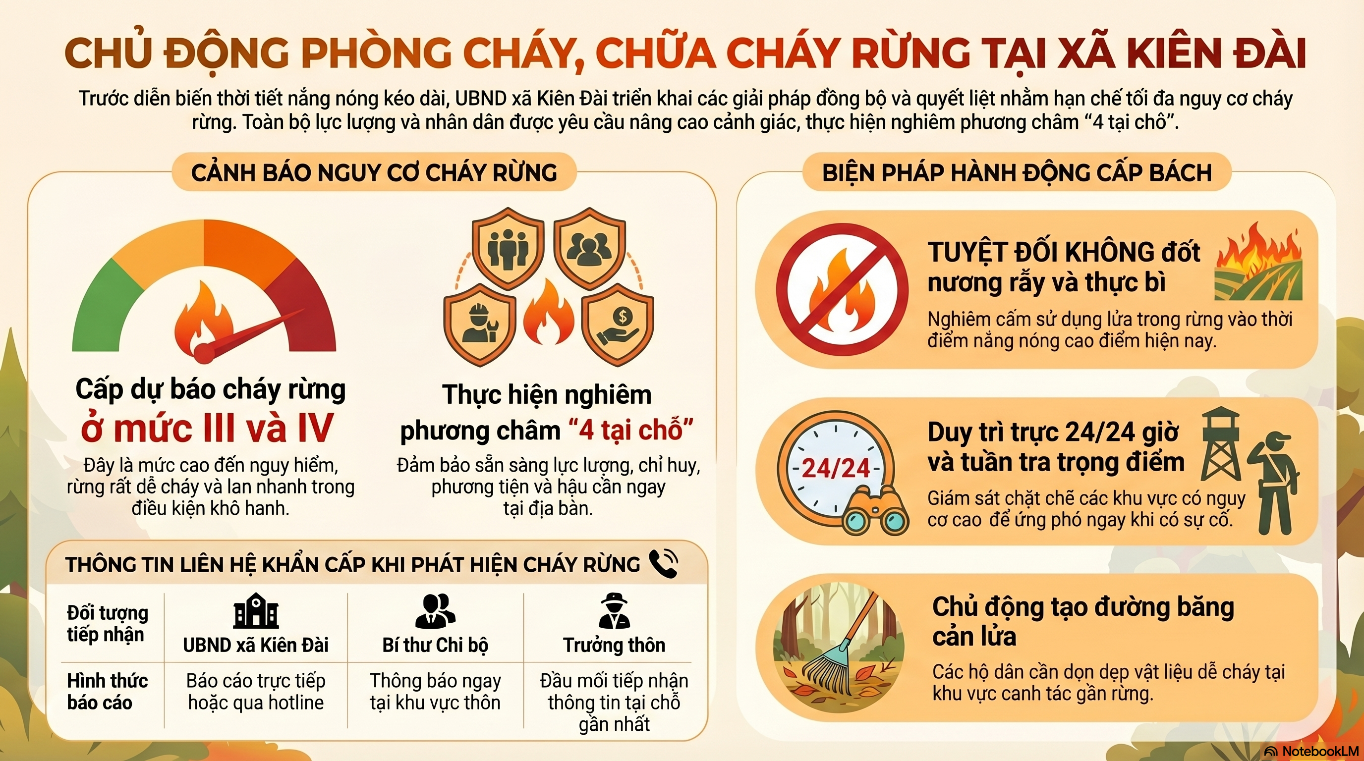 Thực hiện Văn bản số 2430/UBND-KTN ngày 09/4/2026 của Ủy ban nhân dân tỉnh Tuyên Quang về việc tiếp tục quyết liệt triển khai các biện pháp phòng cháy, chữa cháy rừng (PCCCR), trước diễn biến thời tiết nắng nóng kéo dài, UBND xã Kiên Đài đã khẩn trương triển khai đồng bộ nhiều giải pháp nhằm chủ động phòng ngừa, hạn chế thấp nhất nguy cơ cháy rừng trên địa bàn. Nguy cơ cháy rừng ở mức cao, duy trì cấp III – IV